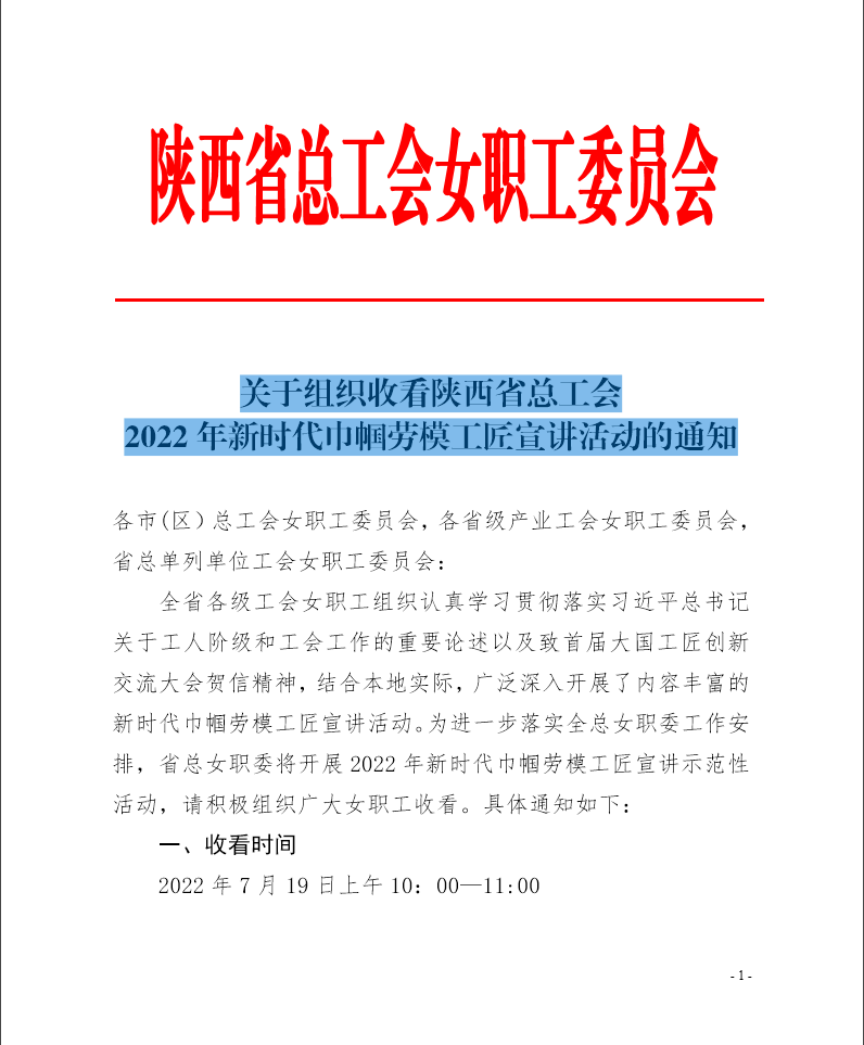 关于组织收看陕西省总工会 2022 年新时代巾帼劳模工匠宣讲活动的通知